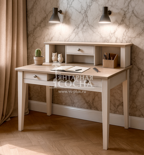 Внутреннее наполнение: два выдвижных ящика на шариковых направляющих у стола, один выдвижной ящик у надстройки стола на деревянных направляющих, глубина надстройки стола 224 мм