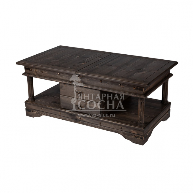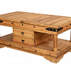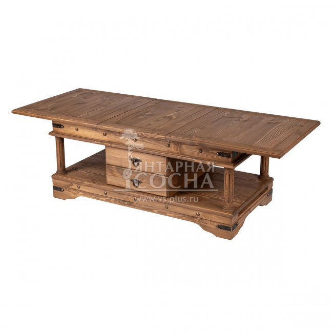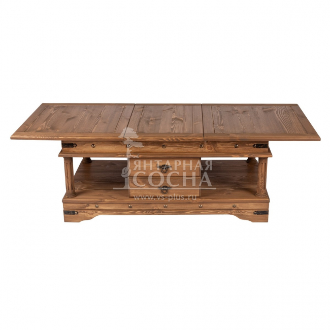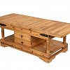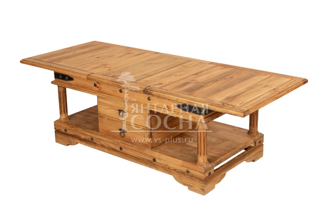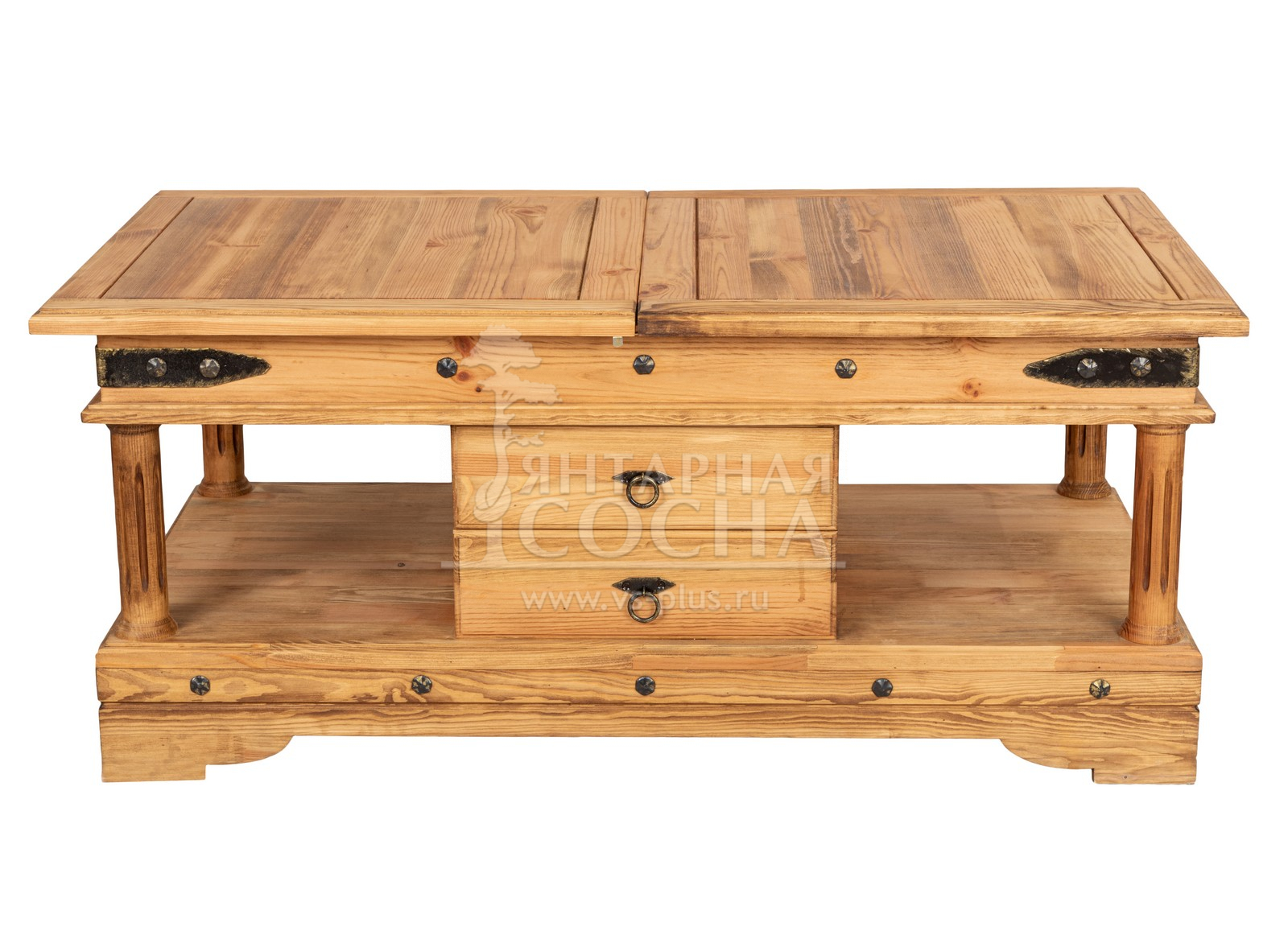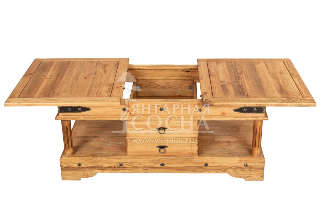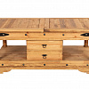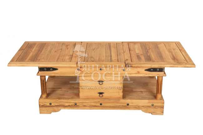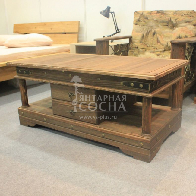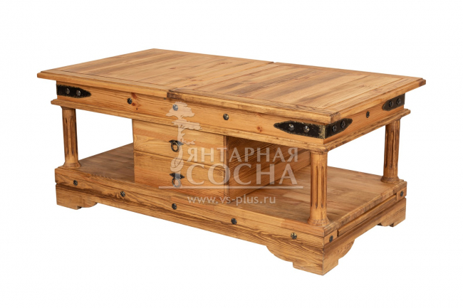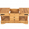 Предмет мебели изготовлен из массива сосны с эффектом старения и восковым покрытием. Стол декорирован контрастными элементами и дополнен кованой фурнитурой.
