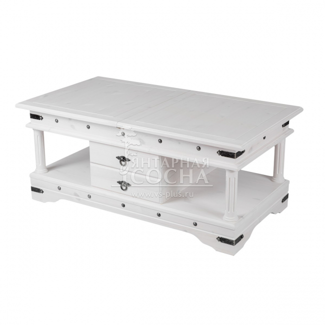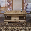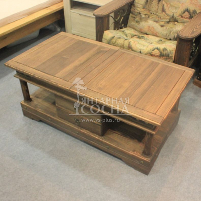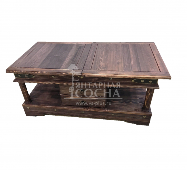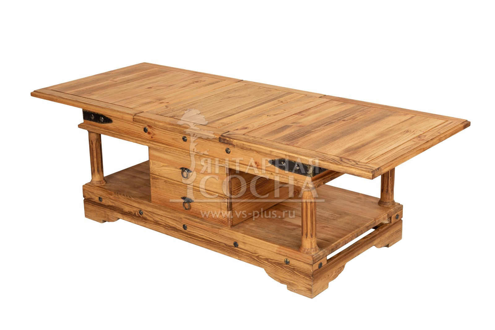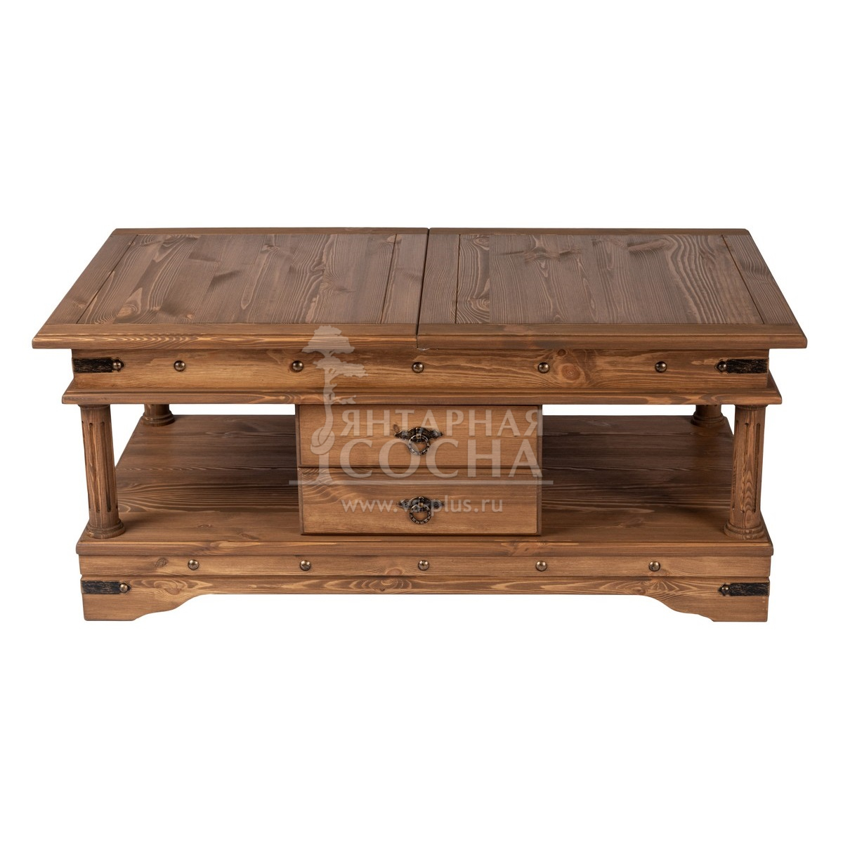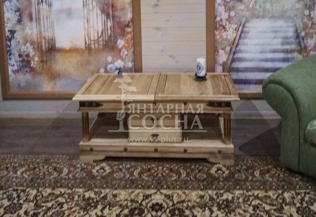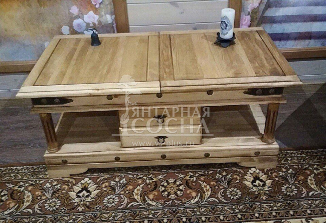 Предмет мебели изготовлен из массива сосны с эффектом старения и восковым покрытием. Стол декорирован контрастными элементами и дополнен кованой фурнитурой.