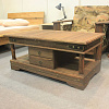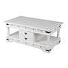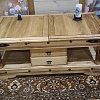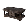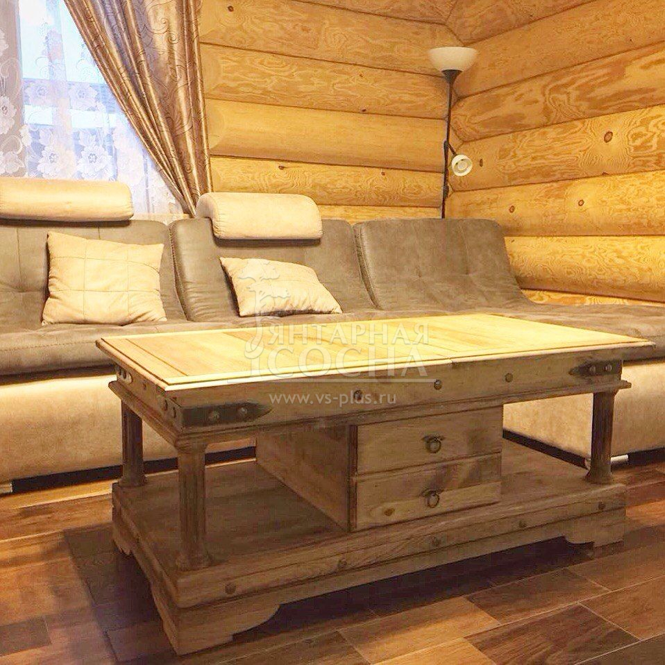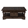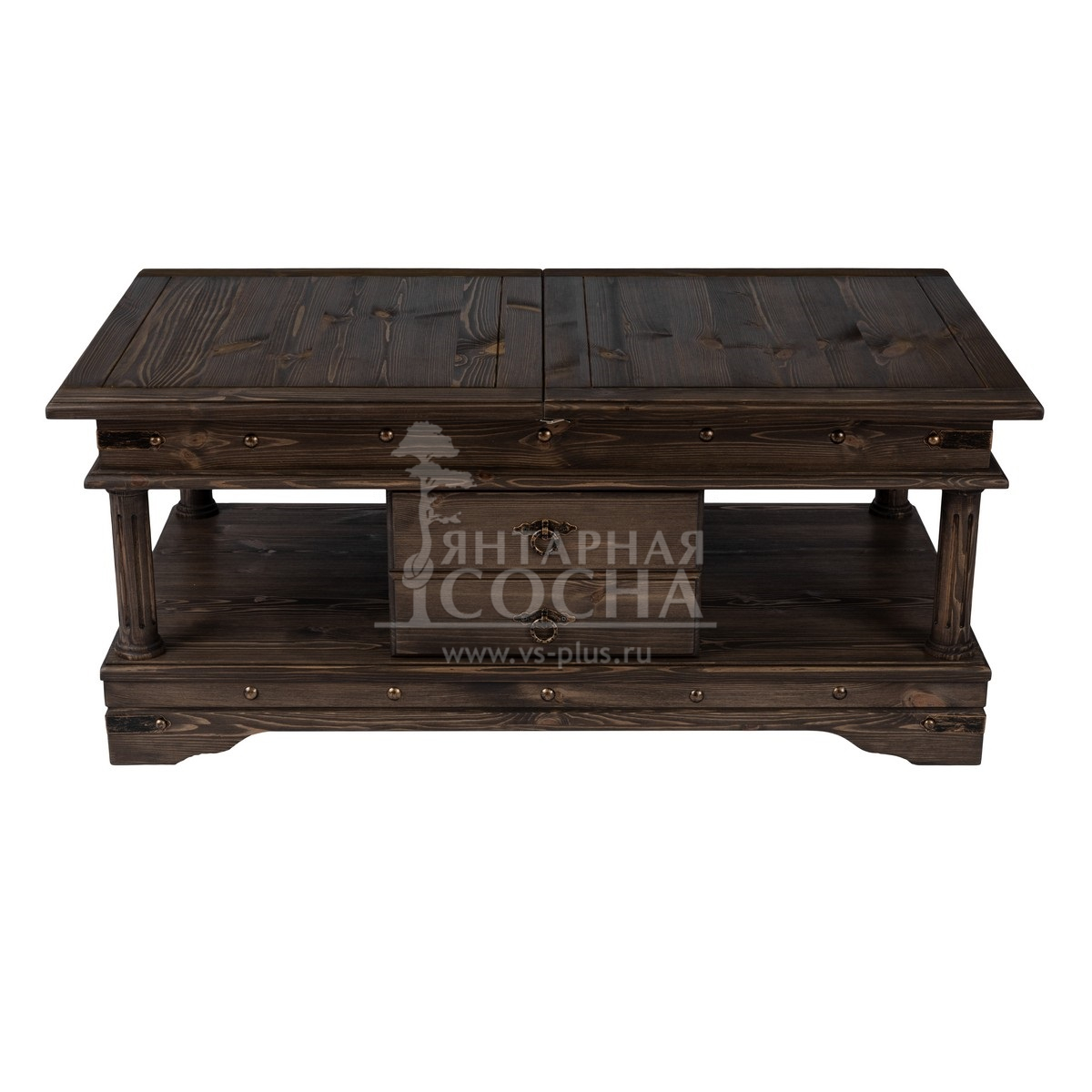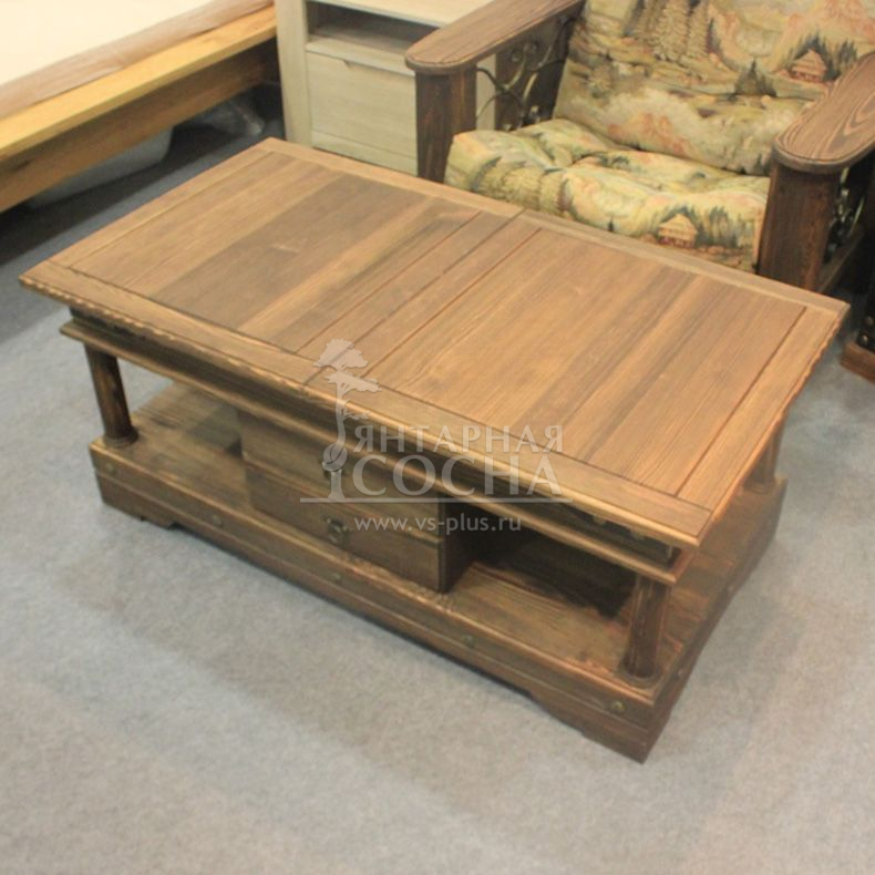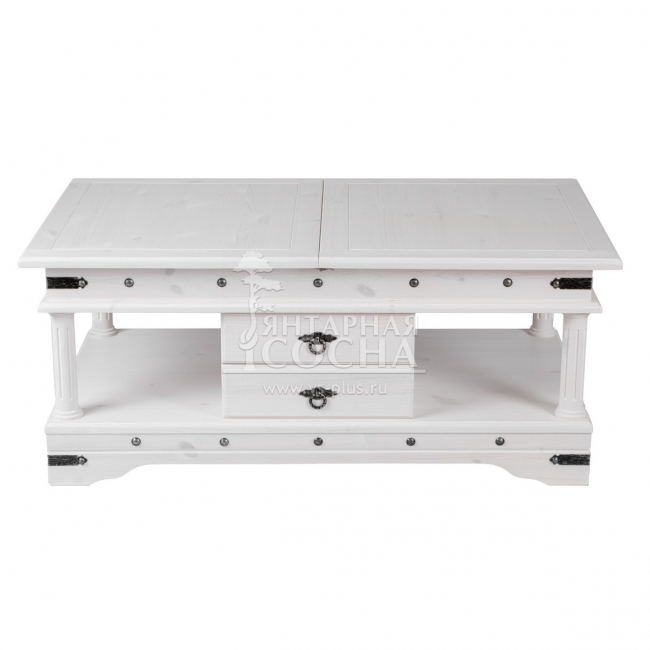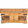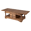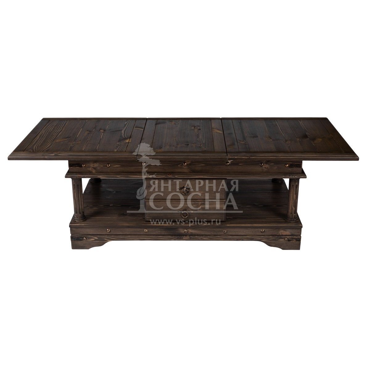 Предмет мебели изготовлен из массива сосны с эффектом старения и восковым покрытием. Стол декорирован контрастными элементами и дополнен кованой фурнитурой.
