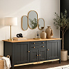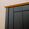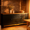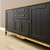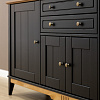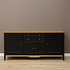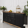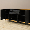 У этой модели комода четыре распашные дверцы и два выдвижных ящика. Донья ящиков изготовлены из прочного белого оргалита, стенки из массива сосны, окрашены в цвет корпуса. Для ящиков предусмотрены шариковые направляющие частичного выдвижения, без доводчиков. Дверцы навешиваются на петлях с доводчиками, закрываются без усилий и бесшумно. Высота от пола до нижнего края планки 12 см, уборку под тумбой можно делать с помощью робота-пылесоса.