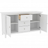 Тумба (комод) оснащена тремя выдвижными ящиками и двумя полками за распашными дверями. Фурнитура на дверях с доводчиками, на ящиках стоят роликовые направляющие. Высокие ножки обеспечивают оптимальный доступ при уборке.