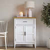 Удобное зонирование. Внутри — отделение с полкой за распашными дверками, сверху расположен выдвижной ящик. Всё под рукой, но при этом скрыто от глаз.