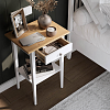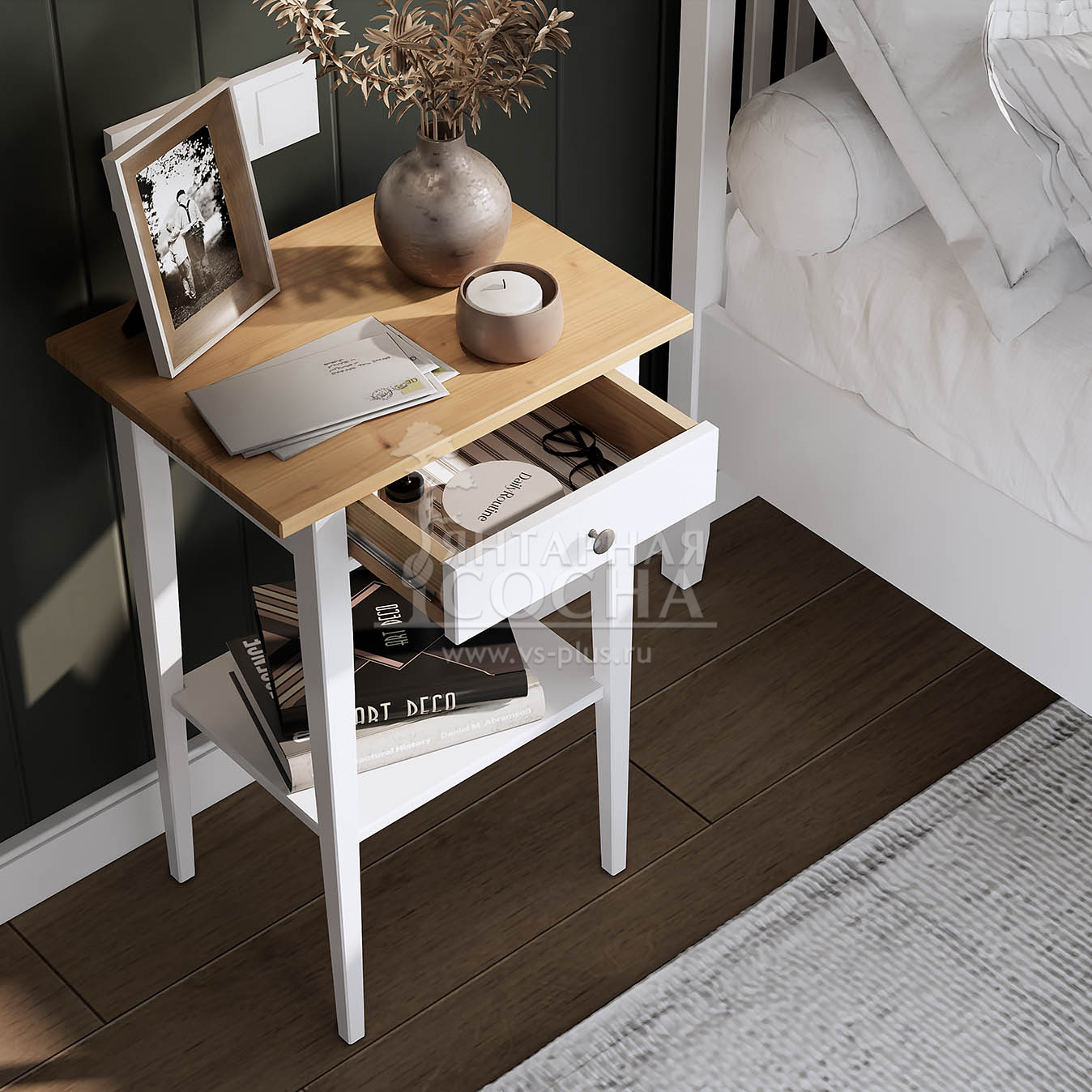 Тумба выполнена из массива сосны — натурального и долговечного материала с приятной текстурой дерева. Толстая столешница подчёркивает основательность конструкции и позволяет удобно разместить ночник, книгу, телефон или декор.
