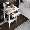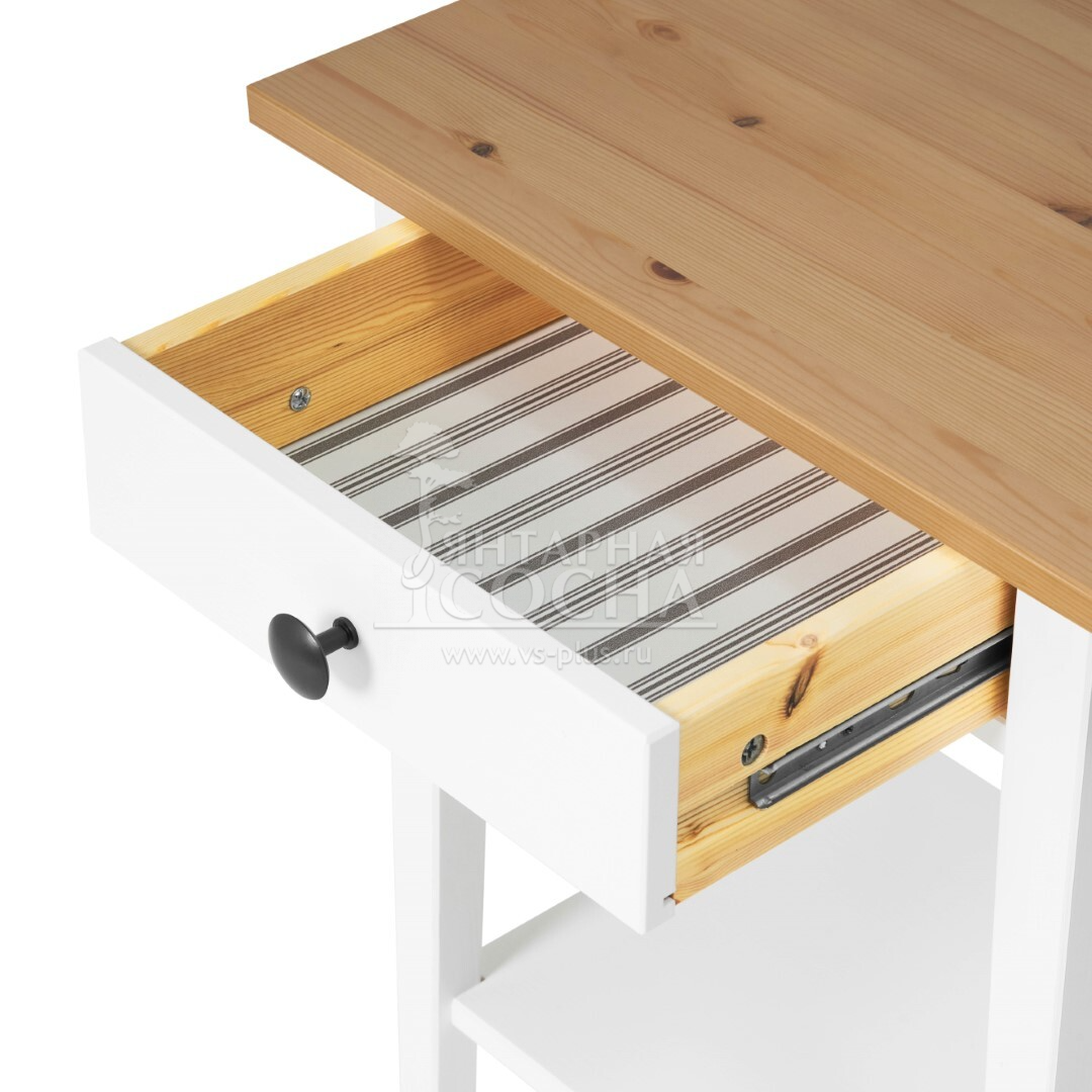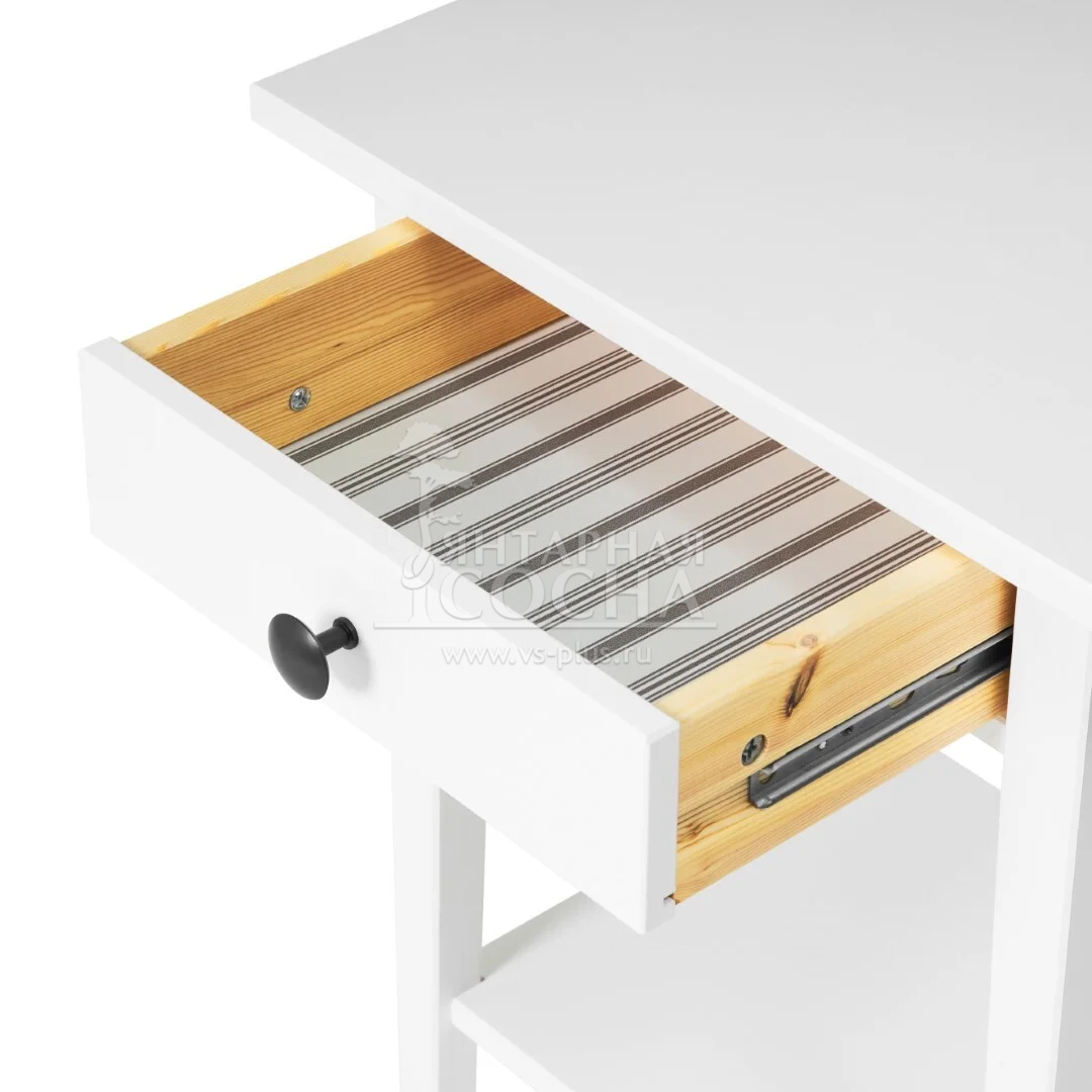 Выдвижной ящик оснащён роликовыми направляющими, обеспечивающими плавное и бесшумное открывание и закрывание. В ящике удобно хранить личные мелочи, которые должны быть под рукой, но не на виду. Дно ящика выполнено из ламинированного ХДФ в декоративном полосатом стиле.