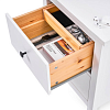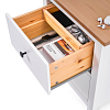 Выдвижные ящики тщательно отшлифованы и покрыты бесцветным лаком, который подчёркивает натуральную текстуру дерева и защищает поверхность. Оригинальные роликовые направляющие обеспечивают плавное и бесшумное открывание и закрывание, добавляя комфорта в повседневном использовании.