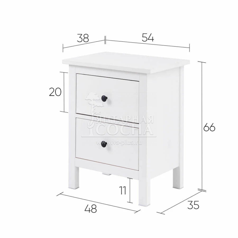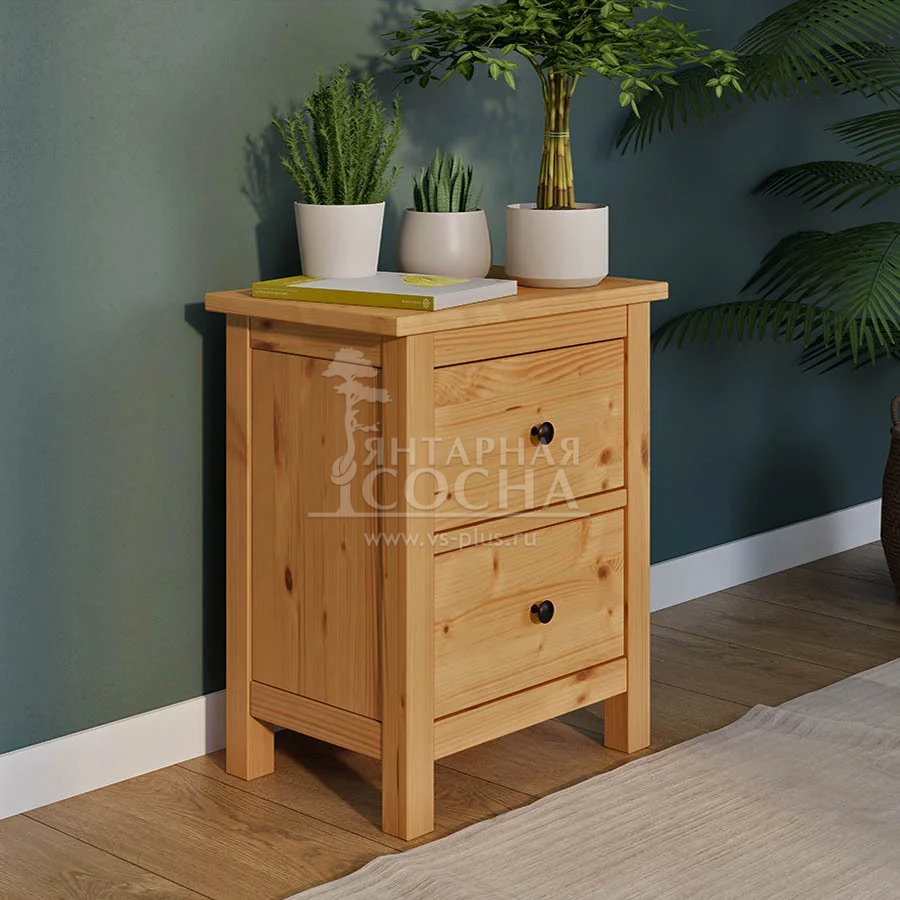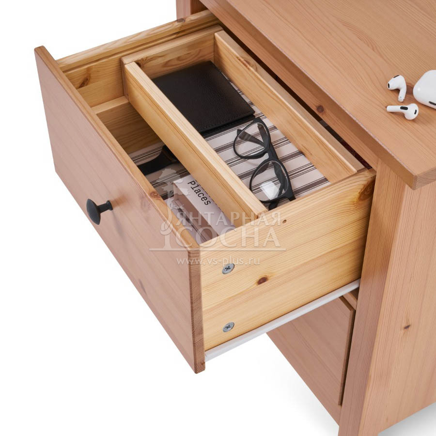 Модель выполнена из массива сосны. Столешница толщиной 20 мм подчёркивает основательность конструкции, а высокие ножки (110 мм) придают тумбе визуальную лёгкость и упрощают уборку под ней.