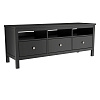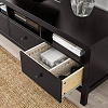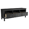 Тумба ТВ оснащена тремя выдвижными ящиками и тремя открытыми полками над ящиками. На ящиках стоят роликовые направляющие. Высокие ножки обеспечивают оптимальный доступ при уборке.