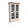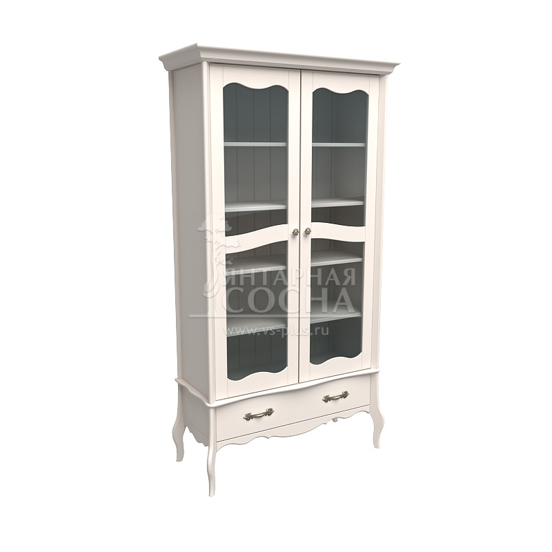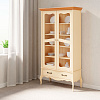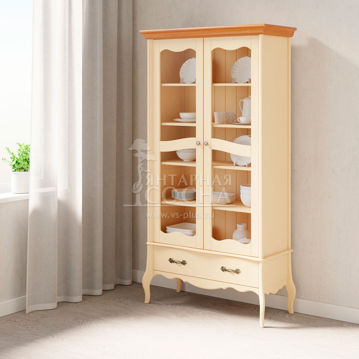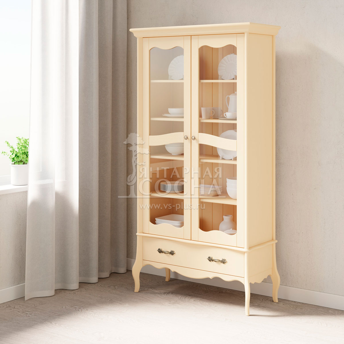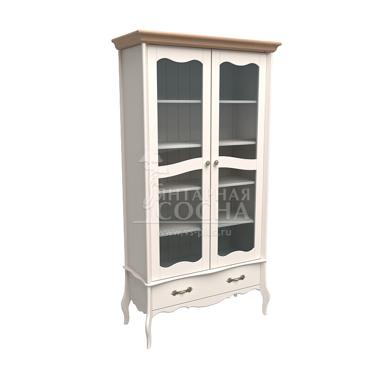гостиной или спальни. Высокая витрина имеет эффектный вид и выполнена из натурального массива сосны, который отличается полной безопасностью. Две двери с прочным стеклом легко распахиваются и позволяют добраться до нескольких полок, которыми оснащен этот предмет мебели. Один просторный выдвижной ящик с металлическими ручками, расположенный снизу, удачно вписывается в дизайн и
